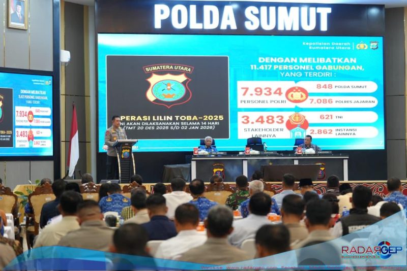 MEDAN | RADARGEP.COM — Polda Sumatera Utara memastikan kesiapan penuh dalam memberikan perlindungan dan pelayanan terbaik kepada masyarakat selama momentum Natal 2025 dan Tahun Baru 2026 melalui Operasi Lilin Toba 2025. Kesiapan tersebut ditegaskan Kapolda Sumut, Irjen Pol Whisnu Hermawan Februanto, dalam Rapat Koordinasi Lintas Sektoral yang digelar di Aula Tribrata Polda Sumut, Rabu (17/12/2025).