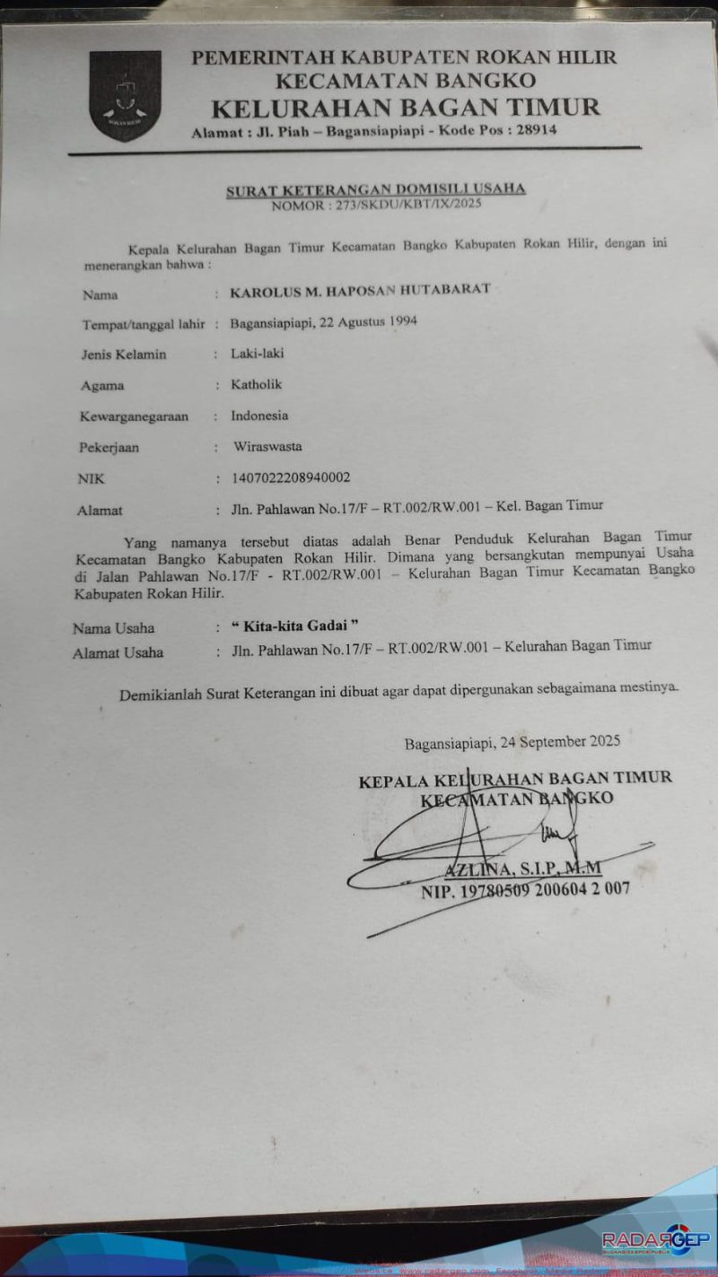 Hosan menjelaskan bahwa operasional usahanya memiliki dasar hukum yang jelas dari otoritas setempat. Ia menunjukkan bukti berupa Surat Keterangan Domisili Usaha (SKDU) yang diterbitkan oleh Kelurahan Bagan Timur pada 24 September 2025.