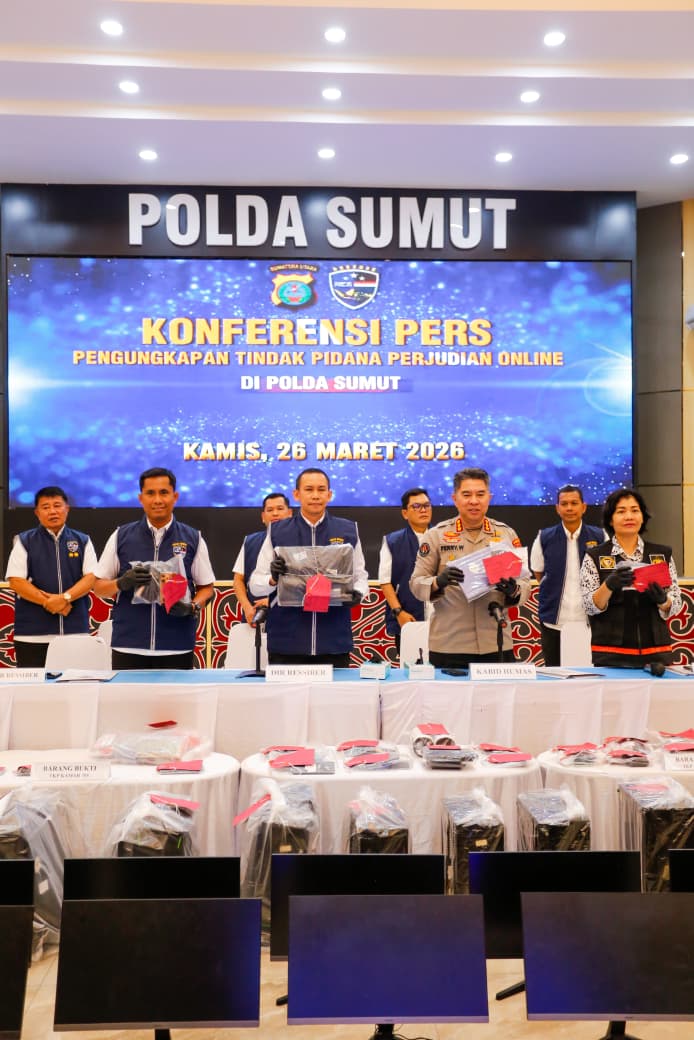 Pengungkapan itu disampaikan oleh Dirresiber Polda Sumut Kombes Pol Dr. Bayu Wicaksono dalam konferensi pers yang dibuka oleh Kabid Humas Polda Sumut Kombes Pol Ferry Walintukan di Aula Tribrata Polda Sumut, Kamis (26/3/2026).