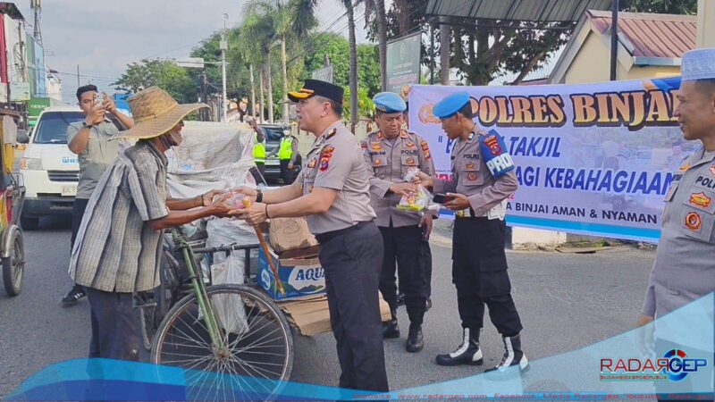 BINJAI | RADARGEP.COM – Kapolres Binjai, AKBP Mirzal Maulana, S.I.K., S.H., M.M., M.H., melaksanakan aksi sosial dengan membagikan takjil kepada masyarakat yang melintas di depan Mapolres Binjai, Jalan Sultan Hasanuddin No. 1, Kota Binjai, Senin (23/2/2026).