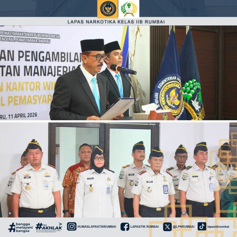 PEKANBARU | RADARGEP.COM – Lembaga Pemasyarakatan (Lapas) Narkotika Kelas IIB Rumbai mengikuti kegiatan Pelantikan dan Pengambilan Sumpah Jabatan Pejabat Manajerial di lingkungan Kanwil Ditjenpas Riau. Kegiatan ini dipimpin langsung oleh Kepala Kantor Wilayah Direktorat Jenderal Pemasyarakatan Riau, Maizar, serta dihadiri oleh para pejabat struktural, Kepala Unit Pelaksana Teknis Pemasyarakatan tanpa terkecuali Kepala Lapas Narkotika Kelas IIB Rumbai, Reinhards Indra Pitoy, rohaniawan, serta para pejabat yang dilantik beserta pendamping, Sabtu (11/04).