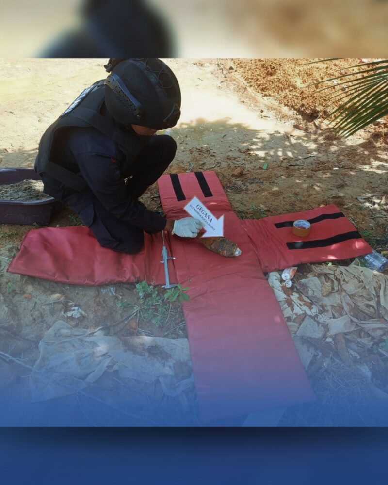 Proses disposal berlangsung dalam suasana penuh kewaspadaan dan konsentrasi tinggi. Setiap tahapan dilakukan secara terukur, mulai dari sterilisasi area, doa bersama, hingga pengarahan teknis kepada seluruh personel. Hingga akhirnya, setelah melalui prosedur yang ketat serta waktu pengamanan yang ditentukan, mortir tersebut berhasil diurai secara aman dan terkendali, sehingga potensi bahaya dapat sepenuhnya dieliminasi.